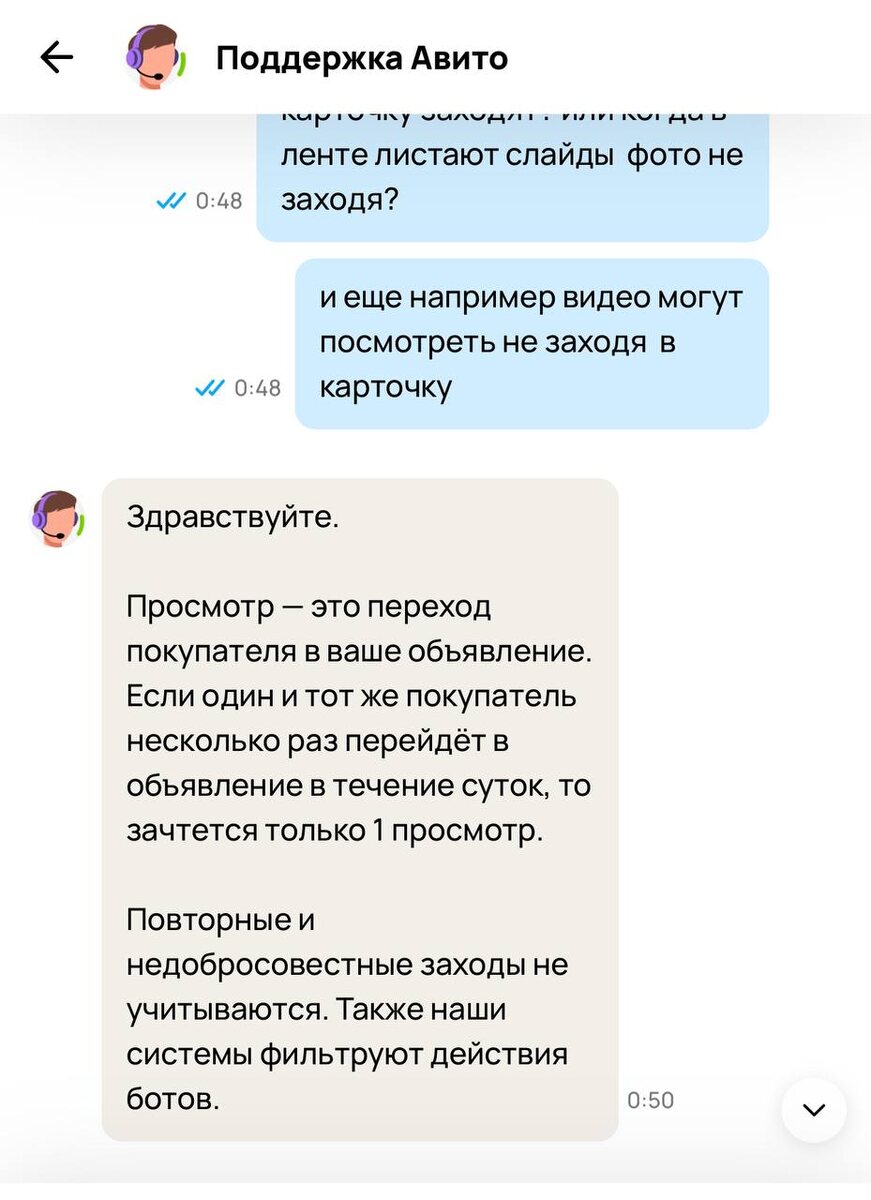 В продолжение к видео на ютуб Со мной решили поспорить в комментариях, что аж с осени все изменилось и теперь 1 уникальный просмотр за весь период считается (жаль там нельзя крепить скрины ответа от Авито) Поэтому прикрепляю сюда (если сами не будете ходить уточнять детали в техподдержке, то ответ от 19 мая 2025 года) Еще раз! 1 уникальный просмотр в течение суток!