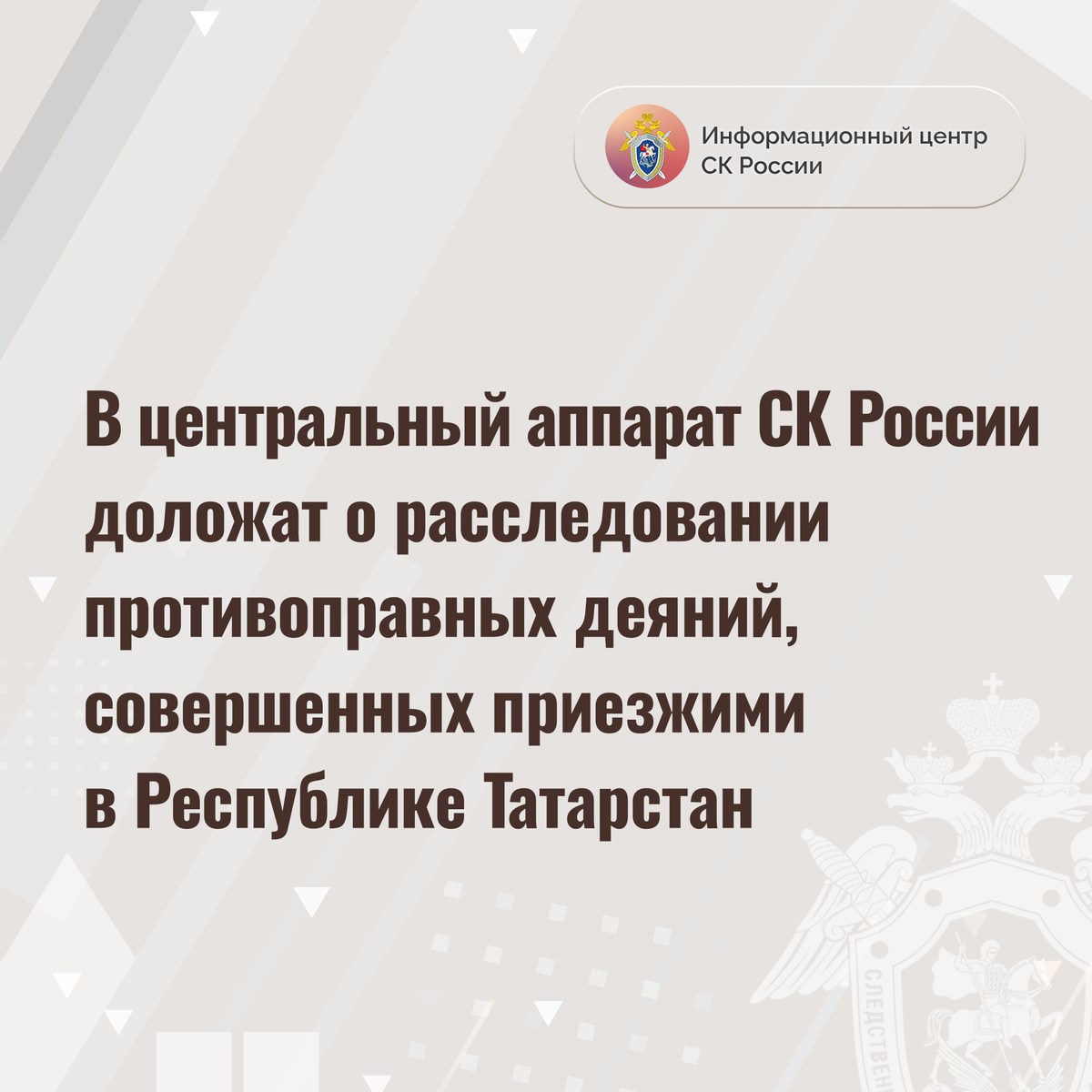 В центральный аппарат СК России доложат о расследовании противоправных деяний, совершенных приезжими в Республике Татарстан