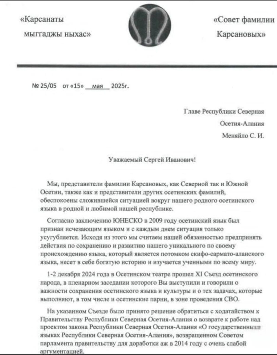Карсановы также направили письмо на имя С.И. Меняйло по поводу принятия Закона "О государственных языках РСО-А"! (@zaervatkkk)