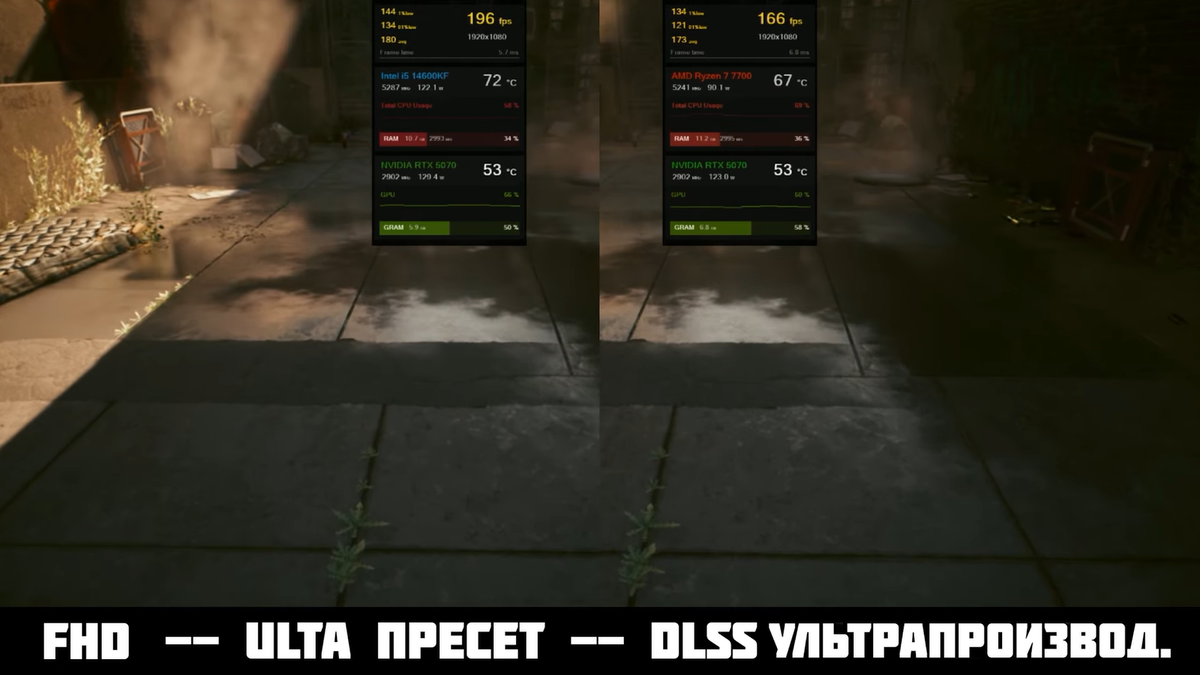 В одном из выпусков на YouTube-канале Power-Art рассказали, чего стоит ожидать в играх от Ryzen 7 7700 и i5-14600KF, а также какой из них лучше покупать. i5-14600KF в целом лучше себя показывает в рабочих задачах, в мультипотоке. Однако апгрейда почти нет и нужна мощная система охлаждения. Что касается Ryzen 7 7700, то он хуже подходит для работы, но легко апгрейдится, лучше в однопотоке. Тестовый стенд включал RTX 5070, кулер ID-Cooling Frozn A610 ARGB, оперативную память 32 ГБ 6000 МГц ADATA XPG Lancer Blade Black. Cyberpunk 2077 шёл в 1080р с ультра-пресетом, DLSS на ультрапроизводительности. В этом случае Intel обогнал AMD на 5-7% по средней частоте кадров. При переходе в 1440р с ультра-графикой, DLSS Off, RTX Off производительность стала почти одинаковой. То же самое касается ситуации с DLSS Quality. Если в QHD поставить ультра-пресето, DLSS On, RTX On, то вновь будет схожий результат. Игра Kingdom Come: Deliverance II запускалась в 1080р с ультра-графикой, DLSS на максимальной пр
