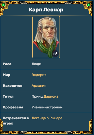 Карл был старшим сыном в королевской семье. В детстве он и его брат Марк дружили с сыном рыцаря Ричардом. После смерти короля Рона именно Карл должен был стать королем Дариона. Однако Карла больше привлекала наука, нежели политика, и он отрекся от трона в пользу своего брата Марка. Марк стал королем, а Карл удалился в Арланию для занятий наукой. Там он жил в своей башне.