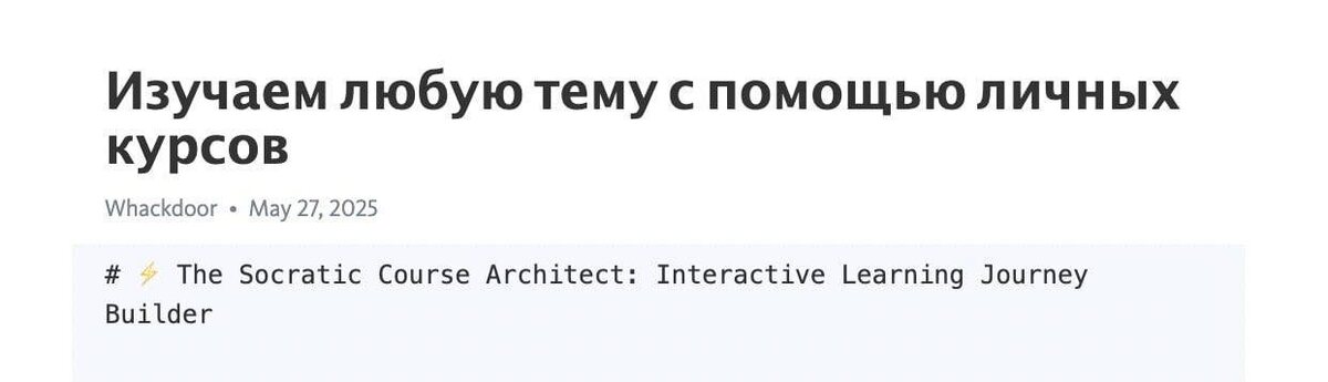 Изучаем ЛЮБЫЕ темы на раз-два с помощью ЛИЧНЫХ курсов — нейронка соберет для вас самые полезные и важные знания по всевозможных вопросам вместе с тоннами практики для дальнейшей работы. • ИИ сгенерит курс из 5 модулей по любой теме. • Сможете задать вопросы по материалу и отработать каждый пункт теории с помощью множества заданий. • Нейронка превратится в самого мощного препода и подстроится конкретно под ваш темп обучения. Когда решите потратить деньги на очередные бесполезные курсы, зарядите этот промпт в ИИ. Он реально огромный, поэтому оставил его — тут.