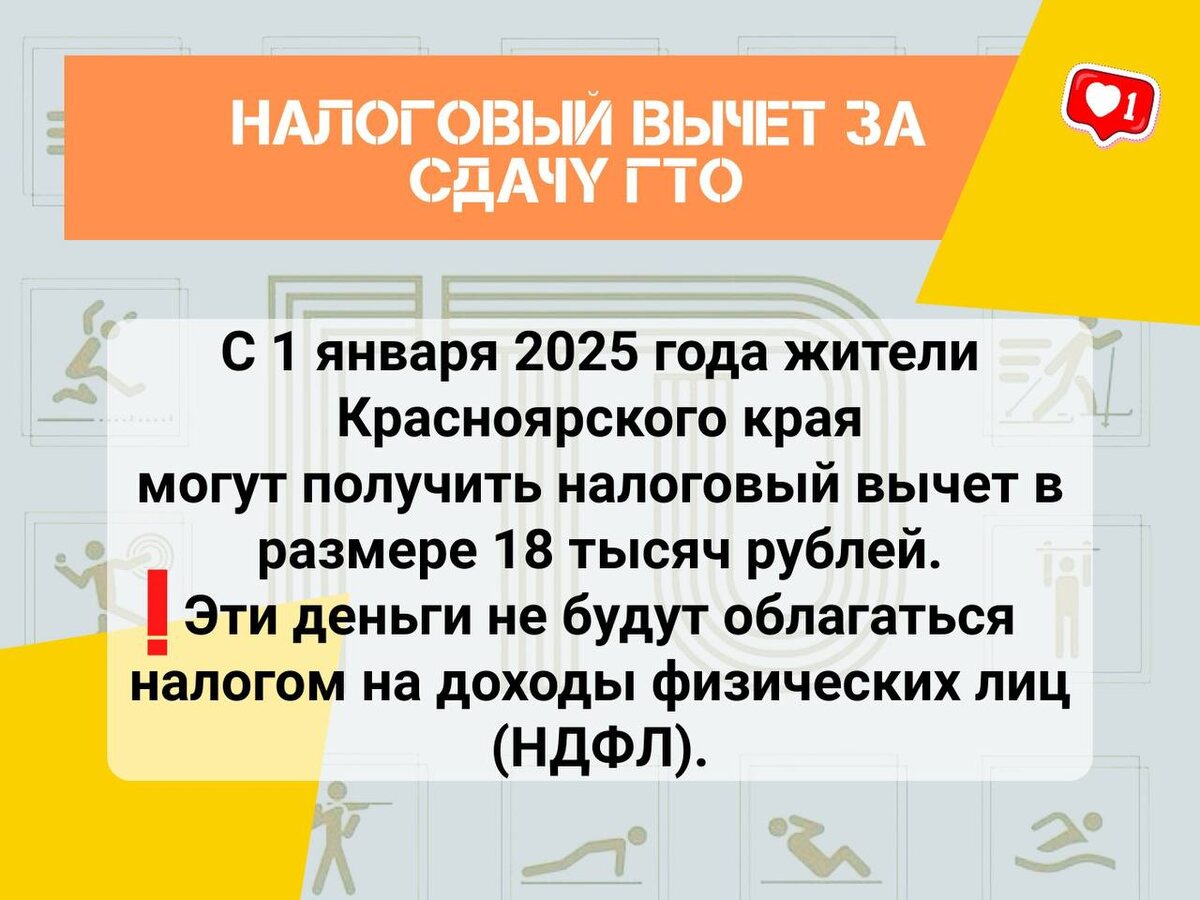 ⚡️⚡️⚡️⚡️Напоминаем, что жители Красноярского края могут получить налоговый вычет за сдачу нормативов Всероссийского физкультурно-спортивного комплекса «Готов к труду и обороне» (ВФСК ГТО), а также за занятие фитнесом и спортом.
