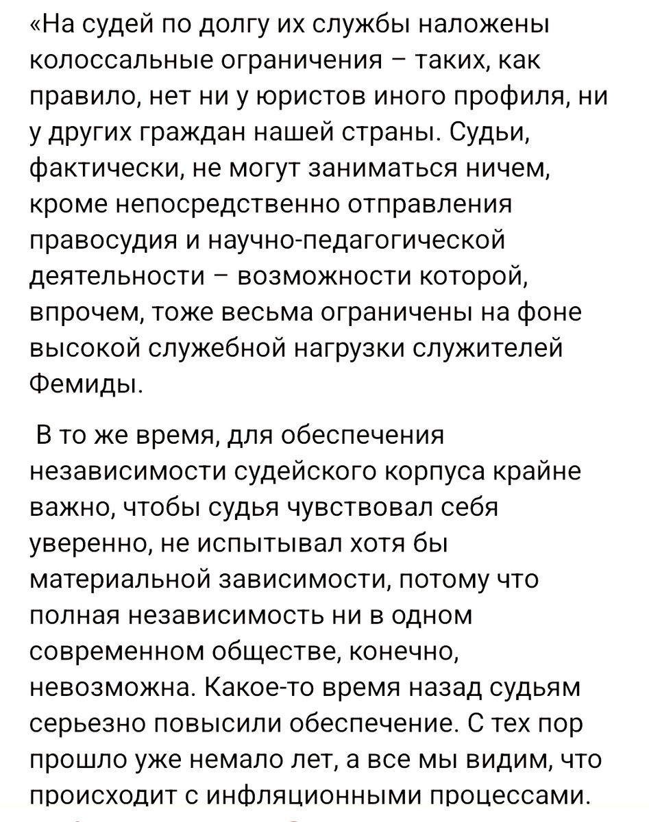 Совет судей РФ предложил «экономически эффективный» механизм повышения зарплат для судей. Под предлогом защиты независимости, борьбы с инфляцией и «беспрецедентной» загруженности, служителям Фемиды намерены изменить подход к назначению дополнительных выплат, премий и поощрений — разумеется, без последствий для бюджета и без влияния на пожизненное содержание тех, кто уже в отставке или только собирается. Действующим судьям зарплата уже жмёт (вы видели ключевую ставку и процент инфляции?) Интересные дела. А кто, кроме судей, не сталкивается с инфляционными процессами? Кто, кроме судей, работает на износ без возможности подработки? Кто, кроме судей, не видел повышения зарплаты годами? Врачи и фельдшеры скорой, преподаватели, инженеры и работяги на заводе посменно, следователи — все они работают в условиях высокой нагрузки, но почему-то не могут собраться на «совет» и решить повысить себе оплату труда. Их нагрузка почему-то не считается достаточно «особой», чтобы обосновать надбавки, прем