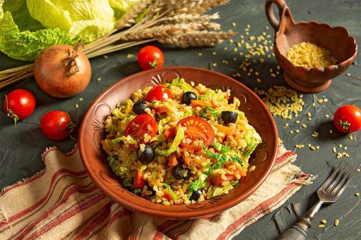 Всыпь готовый булгур к овощам, перемешай и прогрей всё вместе 2–3 минуты. Попробуй — при необходимости досоли и добавь перца. Сбрызни лимонным соком.
