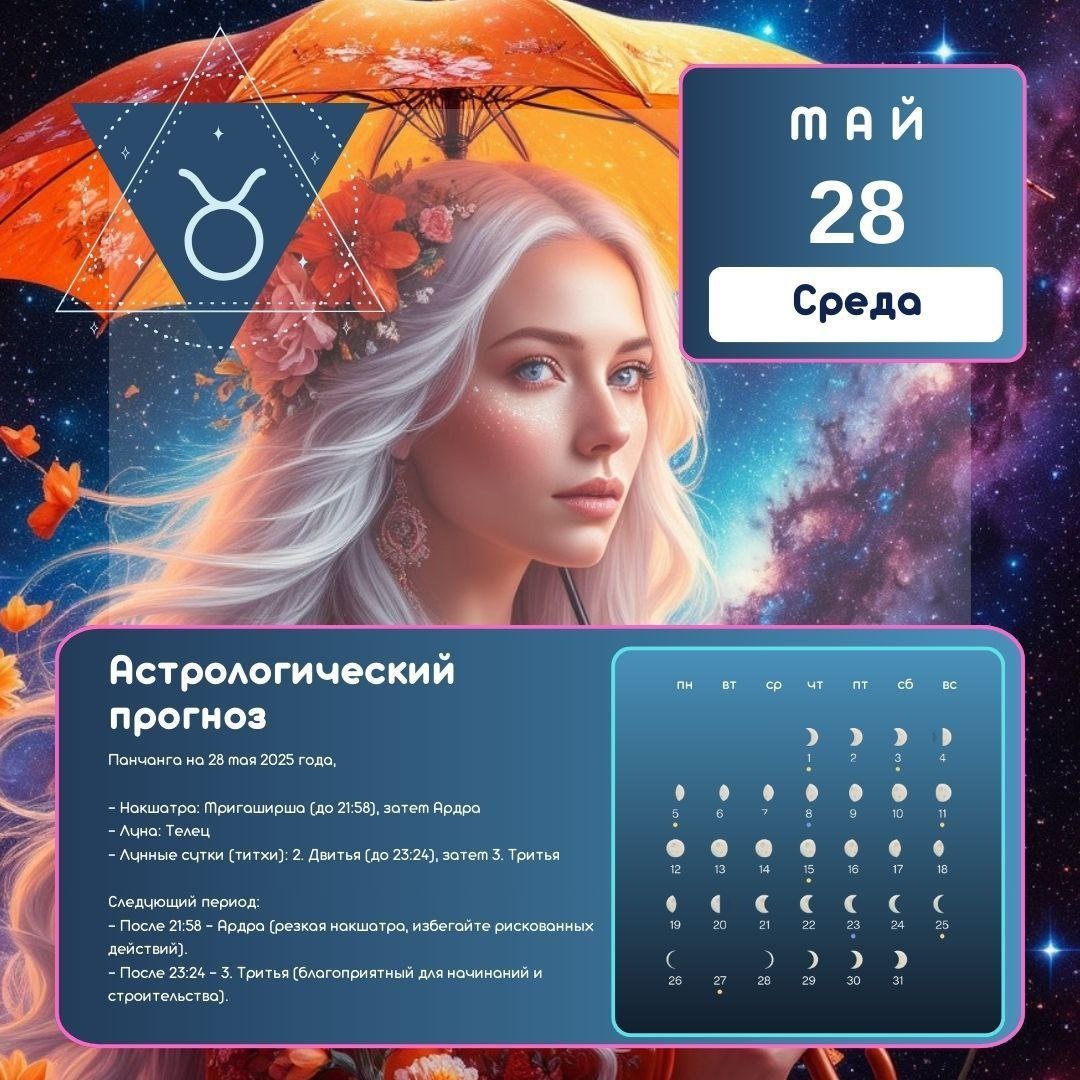 Астрологический прогноз на 28 мая (среда) в системе Джйотиш День Меркурия — интеллект, коммуникация, адаптивность 🩶🩶🩶🩶🩶 🩶🩶🩶🩶🩶🩶🩶 - Луна: 🔘 До 11:07 в Тельце (стабильность, чувственность), затем в Близнецах (общительность, любознательность). 🔘 До 23:24 — 2-е лунные сутки (растущая Луна), благоприятные для начинаний, требующих гибкости. ⬇️ Накшатры: 🔘Мригашира (до 21:58): Период творчества, поиска смыслов, путешествий и гармонии с природой. 🔘 Ардра (после 21:58): Энергия трансформации, но возможны эмоциональные всплески. ⬇️ Йога: 🔘 Комбинационная Сарвартха Сиддха (до 23:24): Успех в благочестивых начинаниях. 🔘 Дхрити Йога (до 16:38) — стабильность; Шула (после 16:38) — осторожность в решениях. ⬇️ Караны: 🔘 Балава (до 12:55) — поддержка новых дел; 🔘 Каулава (12:55–23:24) — удача в партнёрстве; 🔘 Таитила (после 23:24) — завершение задач. Благоприятные активности Акцент на Мригашире (до 21:58): 🔘 Творчество и коммуникация: Переговоры, реклама, обучение, написание тек