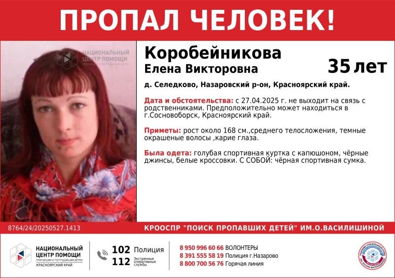 ❗️В Назаровском районе второй месяц разыскивают 35-летнюю жительницу Елену Коробейникову С 27 апреля жительница деревни Селедково, 35-летняя Елена Коробейникова, перестала выходить на связь с родственниками. О ее местонахождении ничего неизвестно. ПРИМЕТЫ: рост около 168 см., среднего телосложения, тёмные окрашенные волосы, карие глаза. БЫЛА ОДЕТА: голубая спортивная куртка с капюшоном, чёрные джинсы, белые кроссовки. С СОБОЙ: чёрная спортивная сумка. «Просим всех, кому известно местонахождение пропавшей, сообщить по телефонам: 8(39155)5-58-19, полиция г. Назарово; «112», единый телефон вызова экстренных оперативных служб; 8-950-99-66-066, ВОЛОНТЕРЫ (круглосуточно)», — обращаются волонтеры к населению. Предположительно женщина может находиться в городе Сосновоборск.