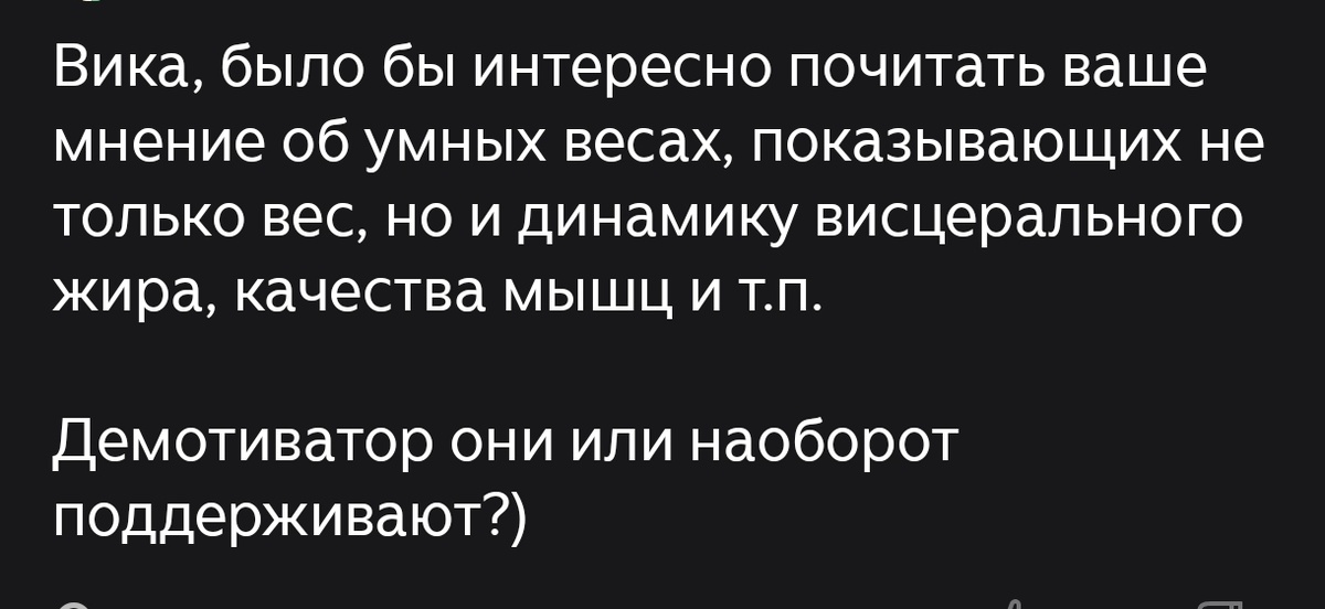 А если вы уже работаете на качество тела, на рекомпозицию, то можно и приобрести весы, главное - с датчиками для рук, ну либо раз в месяц ездить на биоимпенданс.