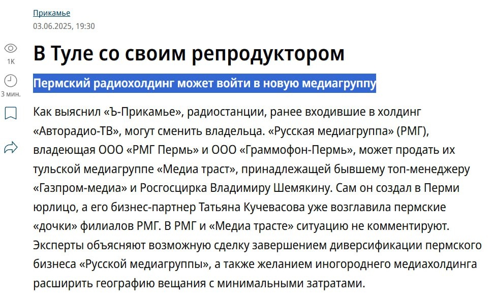 Как выяснил «Ъ-Прикамье», радиостанции, ранее входившие в холдинг «Авторадио-ТВ», могут сменить владельца. «Русская медиагруппа» (РМГ), владеющая ООО «РМГ Пермь» и ООО «Граммофон-Пермь», может продать их тульской медиагруппе «Медиа траст», принадлежащей бывшему топ-менеджеру «Газпром-медиа» и Росгосцирка Владимиру Шемякину. Сам он создал в Перми юрлицо, а его бизнес-партнер Татьяна Кучевасова уже возглавила пермские «дочки» филиалов РМГ... Возможно, „Русская медиагруппа“ таким образом диверсифицирует свой бизнес, то есть избавляется от неприбыльных активов», - пишет КоммерсантЪ