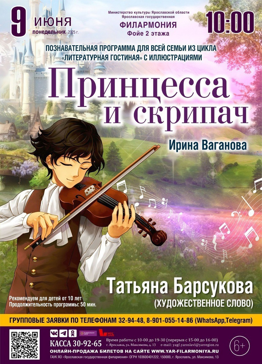 9 июня 2025 г. в 10:00 час. в Ярославской филармонии прозвучит трогательная история «Принцесса и скрипач» о прекрасном музыканте и принцессе, чей талант завораживал всех вокруг, но однажды грустная весть пришла во дворец. А вот что было дальше, Вы узнаете благодаря талантливой чтице, создающей волшебство слова - Татьяне Барсуковой под чарующие мелодии живой скрипки Алевтины Лазаревой.
