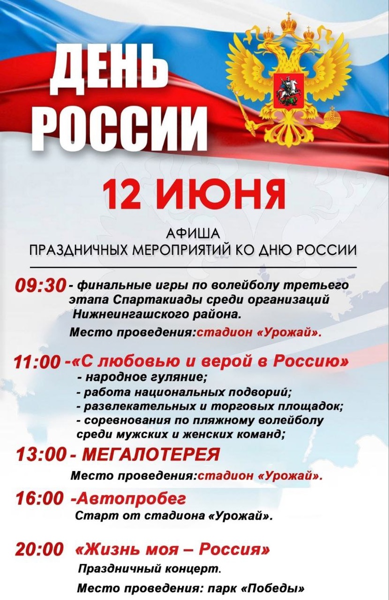 Афиша праздничных мероприятий ко Дню России в Нижнем Ингаше 🇷🇺 09:30 — Волейбол (стадион "Урожай"). 🇷🇺 11:00 — Народное гуляние (стадион "Урожай"). 🇷🇺 13:00 — Мегалотерея (стадион "Урожай"). 🇷🇺 16:00 — Автопробег (старт от стадиона). 🇷🇺 20:00 — Концерт «Жизнь моя – Россия» (парк "Победы"). Будьте частью большого праздника! Присоединяйтесь всей семьей! Будьте частью большого праздника! Присоединяйтесь всей семьей! 📱 Газета "ПОБЕДА" #ДеньРоссии #НижнеингашскийРайон