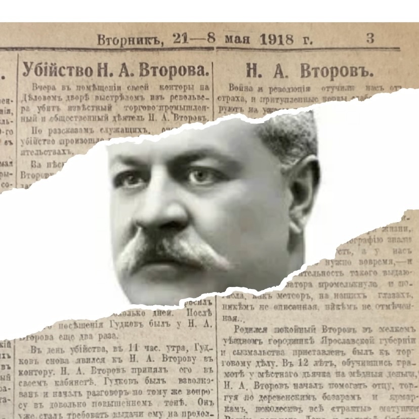 Увеличьте фото с заметкой в газете (она кликабельна и должна увеличиваться). Там описано, что к Второву в кабинет не впервые приходил молодой человек в солдатской форме (что для того времени совершенно естественно, форма была самой распространенной одеждой в стране из-за мировой войны) и просил денег на продолжение образования. Второв не отвергал его, принимал участие и предлагал ему варианты и помощь. В свой последний визит юноша по фамилии Гудков потребовал крупную сумму в 20000 рублей. Второв сказал, что такой суммы при нём нет, и Гудков выхватил револьвер.