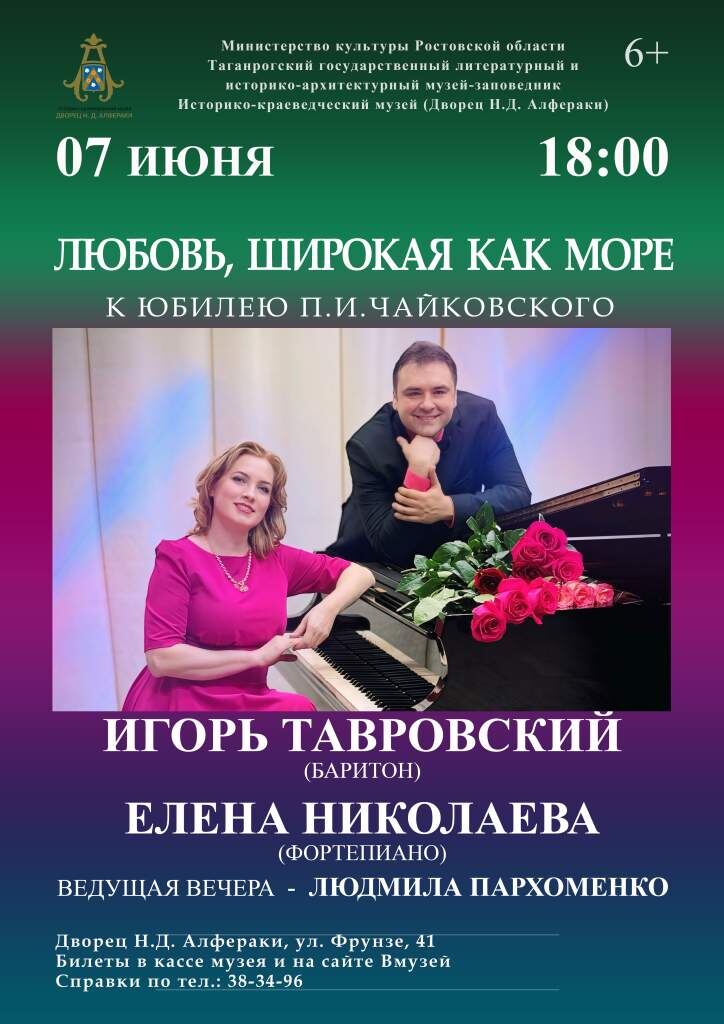 7 июня во Дворце Алфераки Таганрога пройдет музыкальный вечер «Любовь, широкая как море», посвященный 185-летию со дня рождения великого русского композитора Петра Ильича Чайковского. В двусветном зале прозвучат арии из опер, романсы и фортепианные миниатюры великого музыканта, а также произведения его современников, которыми он восхищался. Меломаны смогут узнать много интересных фактов о жизни Петра Чайковского. Музыкальные шедевры исполнят лауреаты международных конкурсов, выпускники РГК им. С.В. Рахманинова Игорь Тавровский (баритон) и Елена Николаева (фортепиано). Игорь Тавровский – победитель международного конкурса Галины Вишневской в Москве, стажировался в Центре оперного пения Галины Вишневской, в Интернациональном вокально-художественном Институте в Израиле, в Нью-Йоркском оперном театре «Метрополитен Опера». Сейчас Игорь Тавровский заведует музыкальной частью старейшего в Ростовской области Донского театра драмы и комедии им. В.Ф. Комиссаржевской. Елена Николаева – пианистка,