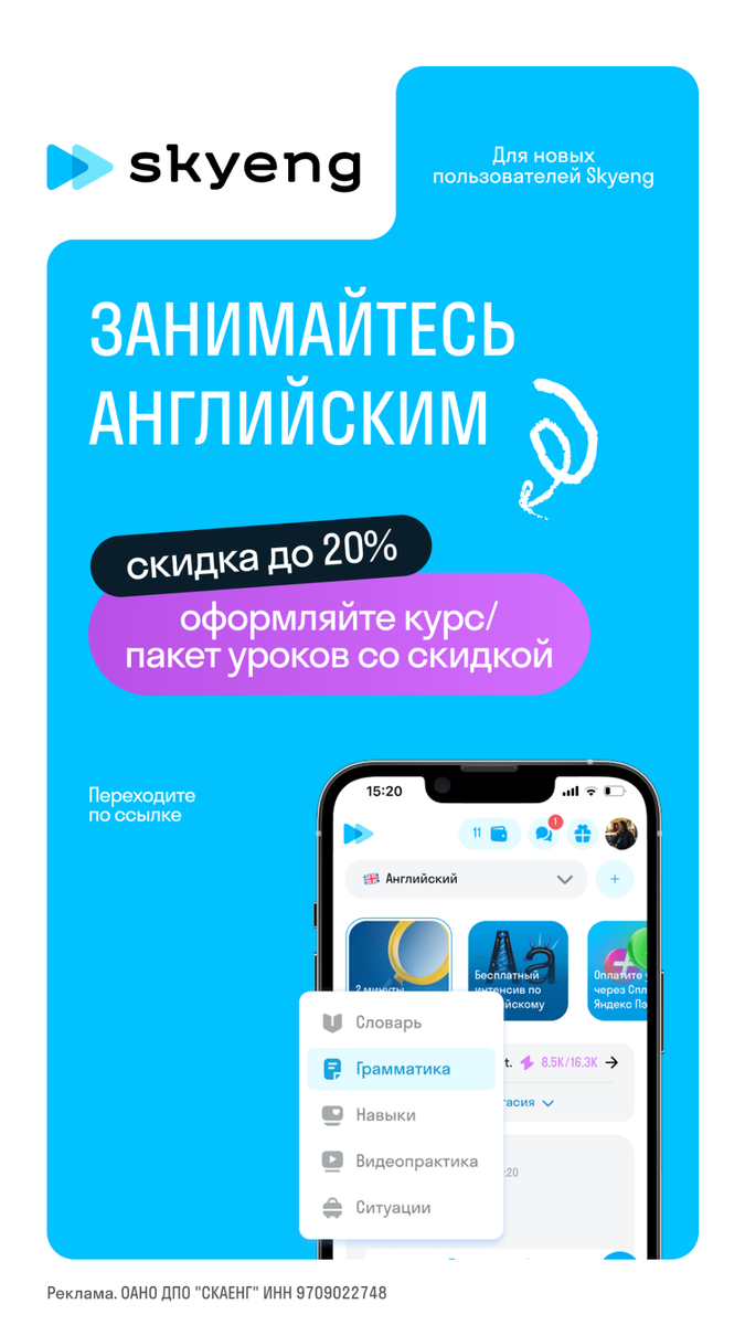 Вы заговорите на английском с 1 занятия! Сразу после первого урока вы сможете отправиться в магазин в Лондоне и объяснить, что вы хотите купить. Английский – язык конструкций. Запомните, как говорить: «я хочу, могу, делаю…», и вы уже сможете построить несложный диалог с прохожим! Интерактивные методики от Skyeng позволяют быстро запомнить основные конструкции языка в игровой форме. Такой подход нравится и детям, и взрослым. А если вам нужно что-то особенное, преподаватели найдут, как вас заинтересовать! Переходите по ссылке https://lesson2.prfl.me/skidka_nvkz/8vcbxf?erid=2VtzqxELFjj и убедитесь в этом сами на бесплатном вводном уроке. А дополнительно вы получите скидку до 20% на покупку курса или пакета уроков для новых пользователей. So, let’s start 🔥