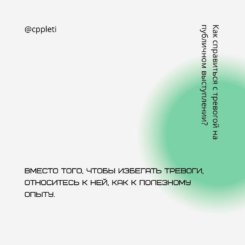 Будь спокоен – у тебя все получится 🍀 Близится летняя сессия, а вместе с ней – финальные защиты курсовых и дипломных работ. Центр психологической поддержки ЛЭТИ рассказал о том, как справиться с тревогой и успешно преодолеть страх публичного выступления. Листай карточки и пересылай однокурсникам📲
