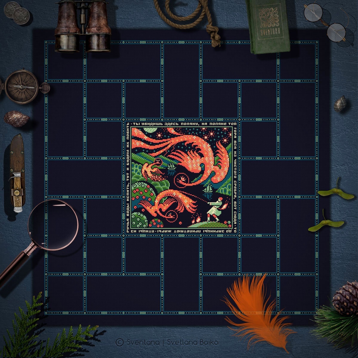 Начала этот дизайн летом 2 года назад с центрального элемента. Вышила чуть больше 3000х и отложила. Очень не понравилось вышивать самих жар-птиц. И вот вдохновившись отшивом другой вышивальщицы, я решила вернуться к этому дизайну и не вышивать жар-птиц, а начать вышивать дерево. Выбирала между березой и кедром, они были куплены еще в 2023 году. Выбрала кедр. В мае вышивала в основном рамки, но и до дерева добралась.