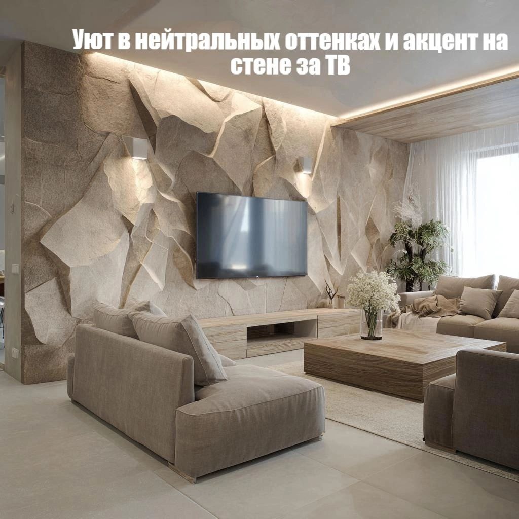 Современный дизайн гостиной: уют в нейтральных оттенках и акцент на стене за ТВ В современном мире дизайн интерьера играет ключевую роль в создании уюта и комфорта в доме. Гостиная, как центральное место для семейных посиделок и приема гостей, заслуживает особого внимания. Одним из трендов в дизайне гостиных является использование нейтральных оттенков, которые добавляют пространству света и воздуха, делая его визуально больше и более приветливым. Но как добавить изюминку в такой спокойный интерьер? Ответ прост - с помощью акцентной стены за ТВ, выполненной из декоративных панелей в виде скал. ### Почему стоит выбрать нейтральные оттенки? Нейтральные оттенки, такие как бежевый, серый, пастельные тонов белого, являются идеальным фоном для любого интерьера. Они не только визуально расширяют пространство, но и создают ощущение спокойствия и расслабленности. К тому же, нейтральный фон позволяет легко менять акценты в интерьере, добавляя яркие детали и аксессуары в зависимости от сезона и