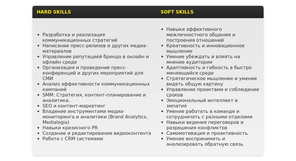 "Навыки: Digital-PR (экспертный уровень), SMM (продвинутый уровень), Копирайтинг (экспертный уровень), Работа с блогерами и СМИ (продвинутый уровень), Анализ эффективности PR-кампаний (продвинутый уровень), Знание инструментов веб-аналитики (Google Analytics, Яндекс.Метрика)."