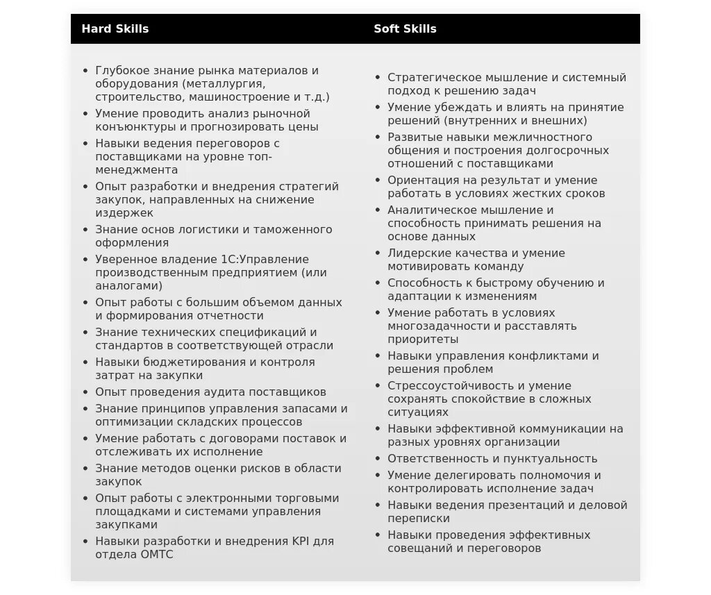 Например, если в вакансии указаны требования "знание рынка поставщиков" и "умение вести переговоры", то необходимо:
