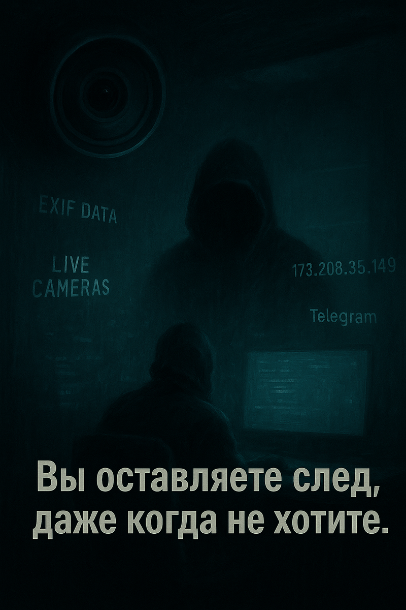 Вы выкладываете фотографию. Отправляете сообщение в Telegram. Проверяете камеру видеонаблюдения или просто подключаетесь к Wi-Fi. И считаете, что этого никто не заметит. Но реальность устроена иначе. Ваши действия порождают цифровые отпечатки, которые можно собрать, расшифровать и использовать. Причём — без взломов и спецсредств. В этой части мы разберём самые бытовые уязвимости, о которых почти никто не говорит — и которые можно использовать против вас. Цифровые фотографии, особенно с телефона, содержат в себе скрытые технические метаданные — EXIF (Exchangeable Image File Format). В них может быть: 📍 Геолокация (широта, долгота, точность GPS) 📱 Модель устройства, версия прошивки 🕒 Время и дата съёмки 🎛️ Направление камеры, параметры съёмки, ISO Даже если вы отключаете геопозицию — эти данные могут всё равно сохраняться, особенно если вы отправляете фото “как файл”. > 💬 Комментарий от ExifTool.org (утечка, 2022): «90% пользователей не знают, что их фото “говорят” за них. Один фа