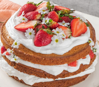 Ингредиенты: - 300 г миндальной муки - 300 г сахарной пудры - 9 яиц - 100 г муки - 5 яичных белков - 100 г сахара Для крема: - 500 г сливочного масла - 500 г сгущенного молока - 1 ч. л. крепкого кофе - 100 г клубники Для сиропа: - 300 г сахара - 50 мл клубничного сиропа - 50 мл воды Приготовление: Разотрите яйца вместе с двумя сортами муки. Затем добавьте сахарную пудру. Белки отдельно взбейте с сахаром и аккуратно введите в общую массу. Присыпьте противень мукой, выложите треть приготовленного теста равномерным тонким слоем и запекайте около 4–5 минут. Повторяйте процедуру до тех пор, пока не испечёте три коржа. Крем готовим следующим образом: сначала хорошо разотрите мягкое сливочное масло, после чего постепенно добавляйте сгущённое молоко и кофе. Сироп готовится путем смешивания всех ингредиентов и варится на слабом огне до загустевания. Каждый корж пропитайте готовым сиропом и собирайте торт, накладывая слои друг на друга (корж-крем-корж). Верхний слой должен состоять исключительно