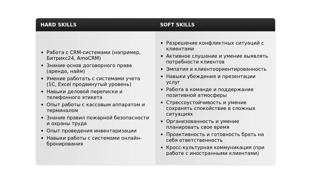 - Навыки: Какие конкретные навыки указаны (например, ведение переговоров, работа с CRM, знание договоров)?