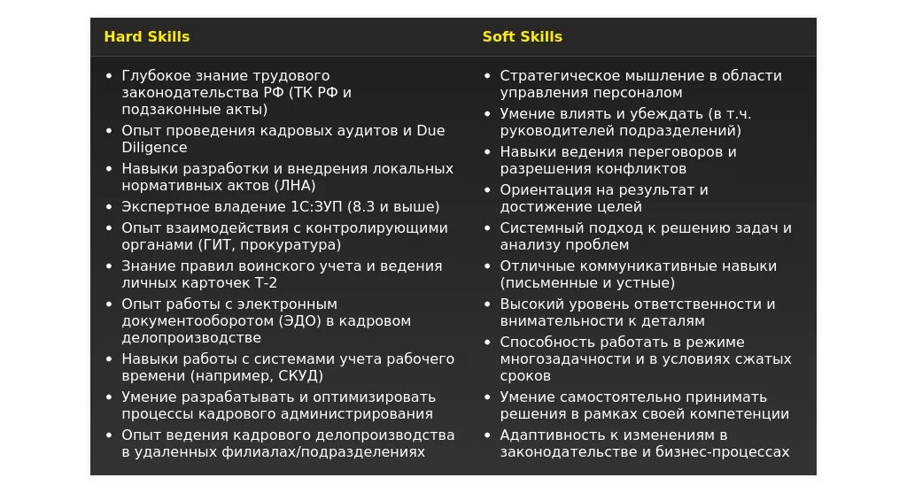 До: "Знание ТК РФ, ведение кадрового делопроизводства, работа с компьютером." Слишком общий список, не выделены важные навыки.После: Профессиональные навыки:Экспертное знание трудового законодательства РФ (включая последние изменения).