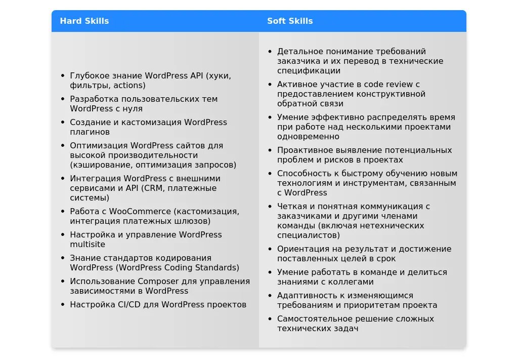 - На какие качества и навыки делать акцент:Твердые навыки (hard skills): WordPress, PHP, HTML, CSS, JavaScript, MySQL.