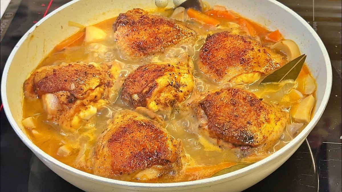 Основное: Для маринада: Для соуса: Для гарнира: 1. Маринад и обжарка: 2. Овощная основа: 3. Создание соуса: 4. Томление: 5. Гарнир: Выложите картофельное пюре, сверху — куриные бедра, полейте соусом. Посыпьте кунжутом и украсьте розмарином. ✔ Нежная курица — томление в соусе делает мясо тающим.