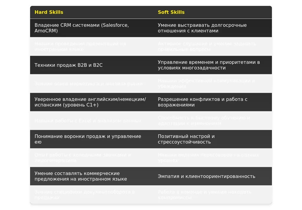"Навыки: Продажи IT-решений (средний), проведение презентаций (продвинутый), знание немецкого языка (B2), Excel (продвинутый)."