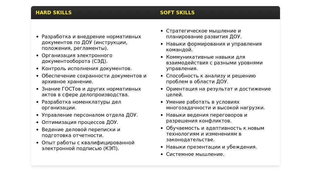 - На какие качества и навыки делать акцент: Внимательность к деталям, ответственность, организованность, знание нормативных документов, умение работать с большим объемом информации, владение офисными программами и системами электронного документооборота.
