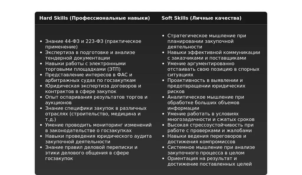 Ключевые навыки и компетенции, релевантные для госзакупок.