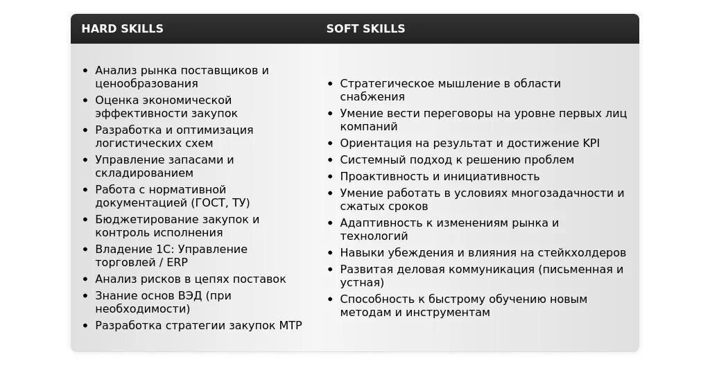 - Торговля: "Управление ассортиментом", "анализ продаж", "ведение переговоров с поставщиками", "управление логистикой".