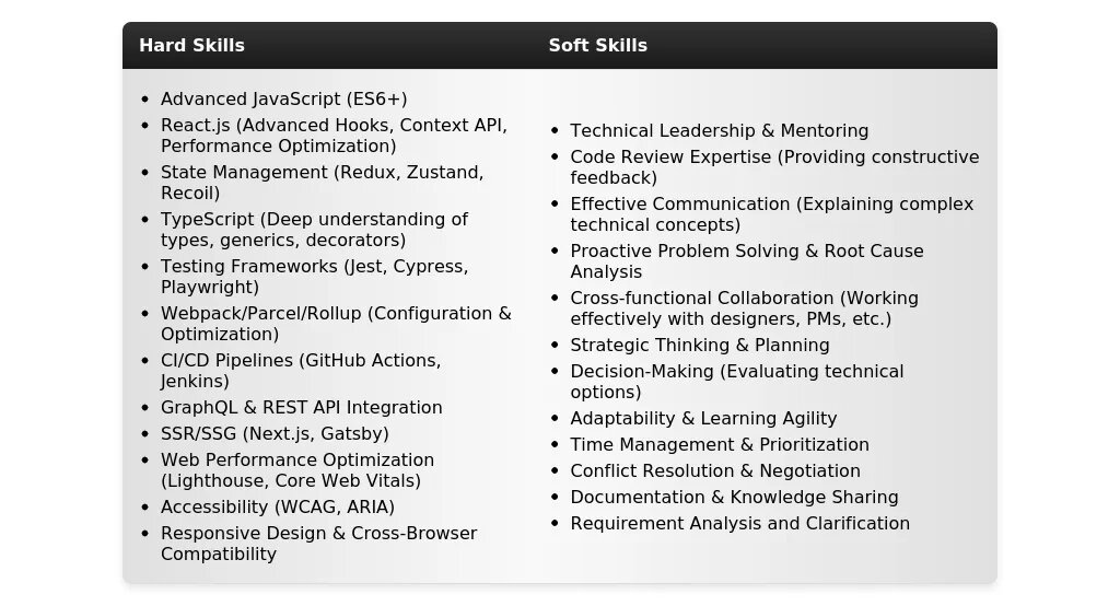 Использование ключевых слов в заголовке и резюме в целом поможет рекрутерам быстрее найти вас в базах данных и увеличить ваши шансы на получение приглашения. Вот список ключевых слов, которые стоит использовать для позиции Senior Front-end JavaScript Developer: