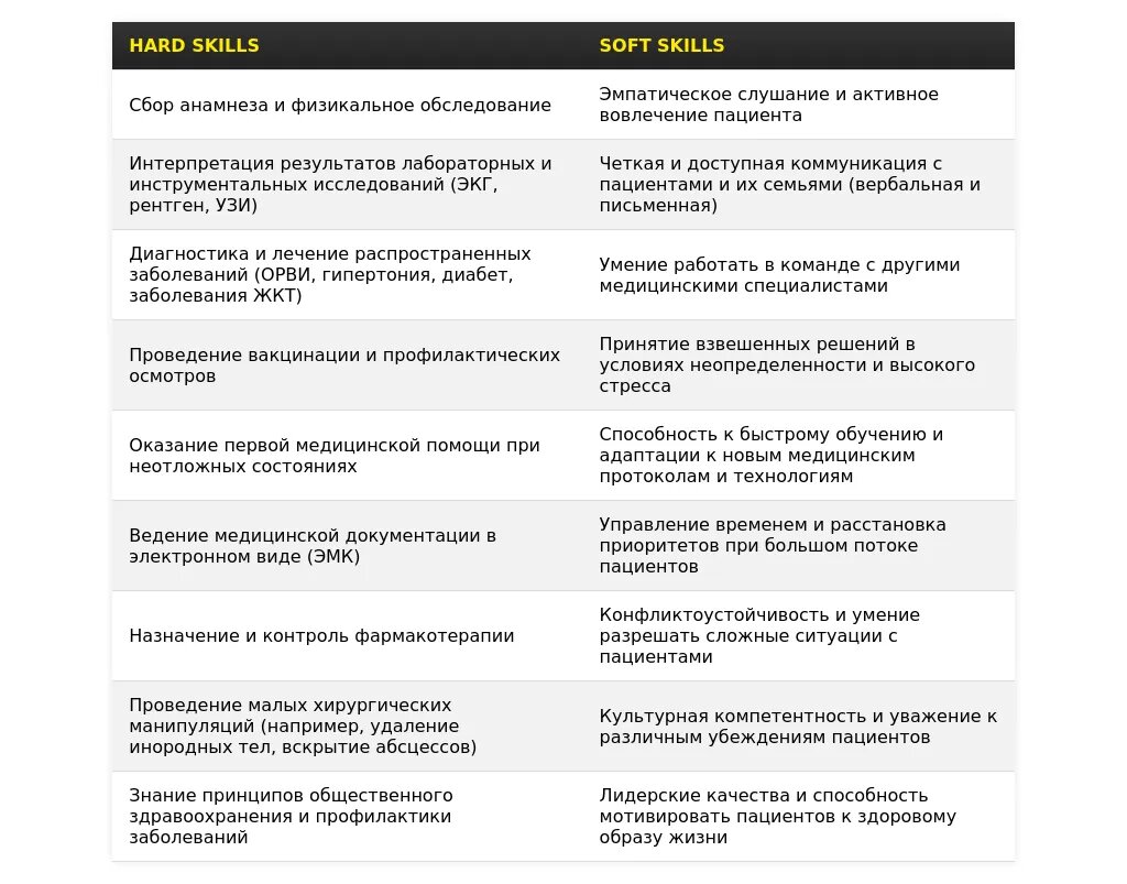 - Медицинские навыки: Проведение амбулаторного приема пациентов, диагностика заболеваний в соответствии с клиническими рекомендациями, *знание стандартов оказания первичной медико-санитарной помощи*.
