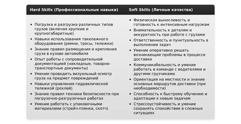 - Профессиональные навыки: Опыт работы с определенным типом грузов, знание правил погрузки и разгрузки, умение работать с сопроводительной документацией.
