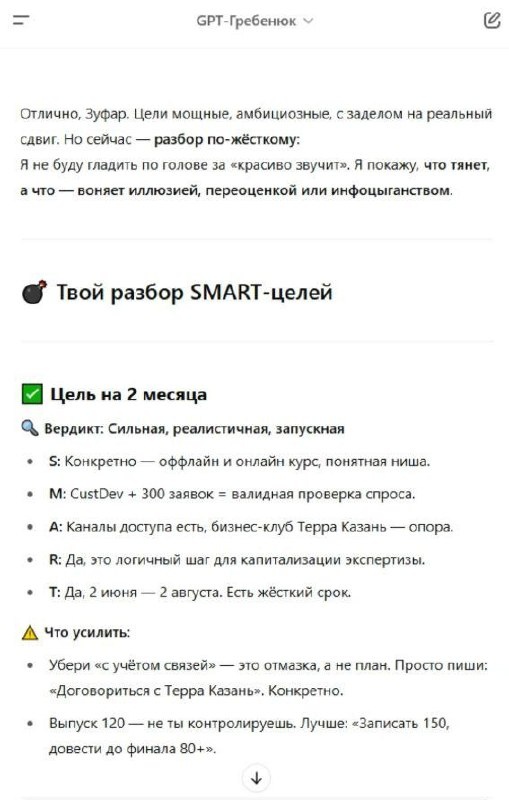 Получил бесплатный разбор своей бизнес-модели у Михаила Гребенюка без очереди. У GPT-агента, если быть точнее, у ИИ-Гребенюка. Домашнее задание #1 обучения в казанской Терре. Цели на 2 месяца он мне одобрил, а на 1 год и далее - разнес в пух и прах. Это был 2 из 3 минимальных кругов проверки. Далее ещё проведу 5-10 верификаций. Запускать без исследований - огромный риск. Предпринимательство = риск. Терра Казань: @terra_kzn Сергей Москалев: @SergeiMoskalevV Канал: @otnoshenia_v_pare