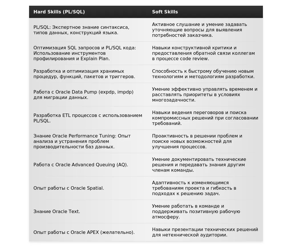 Комментарий: В адаптированном варианте навыки сгруппированы по категориям, указан уровень владения каждым навыком, наиболее важные навыки (PL/SQL, SQL, анализ данных, разработка отчетов) выделены.