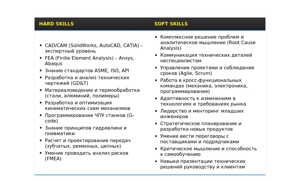 - Инженер-конструктор: "Разработка конструкторской документации", "Проектирование машиностроительных узлов", "Проведение прочностных расчетов", "Оптимизация конструкции".