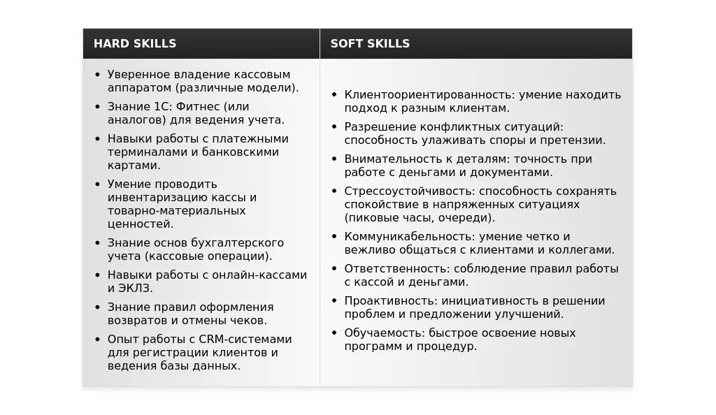 - Перечислены ли в разделе "Навыки" навыки, необходимые для выполнения работы кассира в фитнес-клубе?