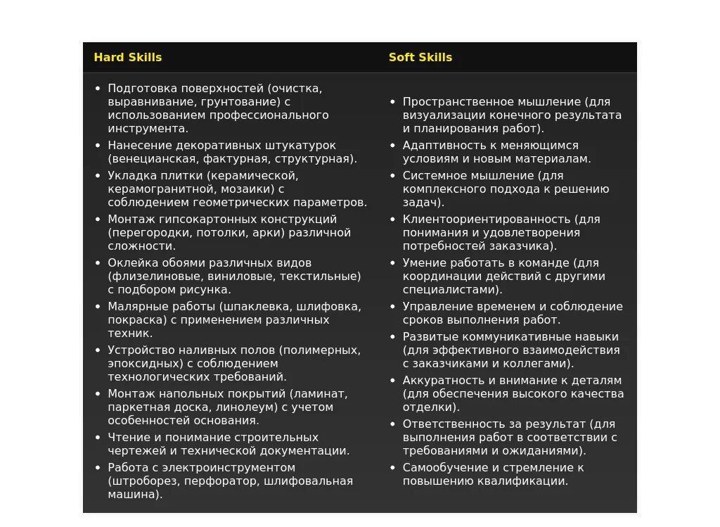 Плохой вариант: "Отделочные работы, чтение чертежей, работа с электроинструментом." (Не адаптировано под вакансию)