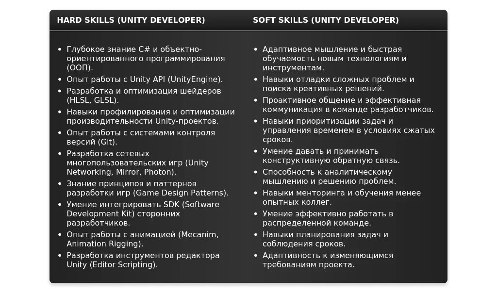 - Senior Unity Developer – для опытных разработчиков с глубокими знаниями Unity, опытом оптимизации и архитектуры проектов, а также навыками менторинга.