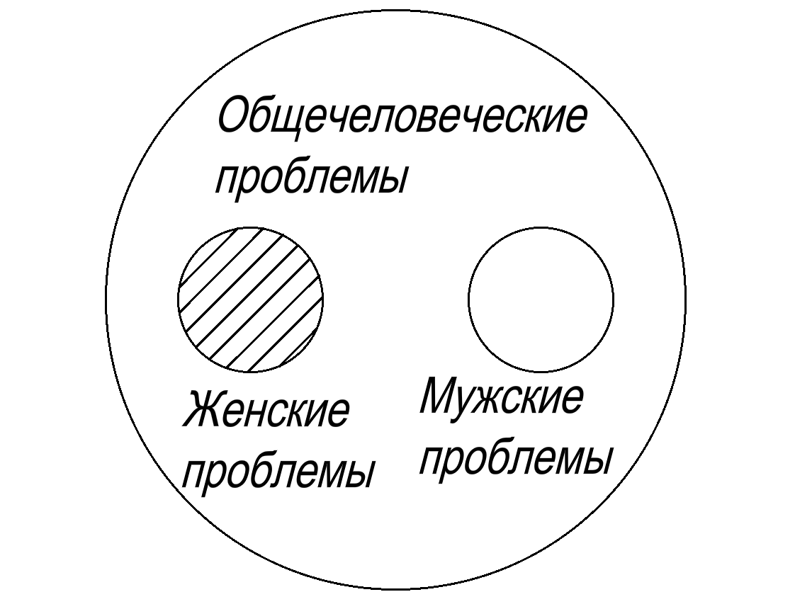 Столкнулась с конкретным непониманием. Написала на своём женском канале несколько статей касательно сложностей, с которыми сталкивается женщина в быту, на работе и в интернет-пространстве. И тут слышу от нашего «сильного пола» дикий вой на болотах, дескать, мои статьи гендерно-перекошенные и тому подобное. Оказывается, что наши мальчики дискриминируются, когда на женском канале в женских статьях не упоминают их мужские проблемы. Для наглядности нарисую круги Эйлера. Вот есть понятие «общечеловеческие проблемы», в его объём входят понятия «женские проблемы» и «мужские проблемы». И если я посвящаю статью «женским проблемам», с какой стати я должна обязательно упоминать мужские? Получается, если я напишу на этом канале статью, касающуюся женских лифчиков, то эти дяди начнут пищать о том, что я их обижаю тем, что не пишу здесь ещё и об их труселях. Мне кажется, это настолько простые вещи, что их поймёт даже шимпанзе. Представляете весь идиотизм их претензий? Цирк абсурда. Если следовать их