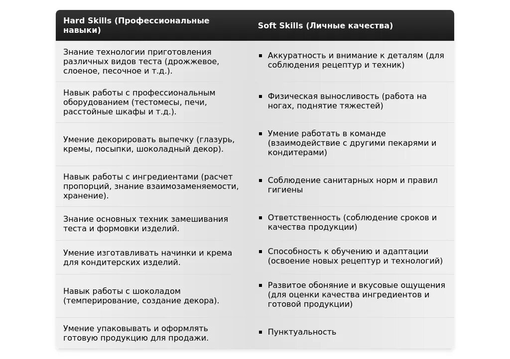 "Навыки: Замес теста, выпечка хлеба, приготовление кремов, работа с компьютером."