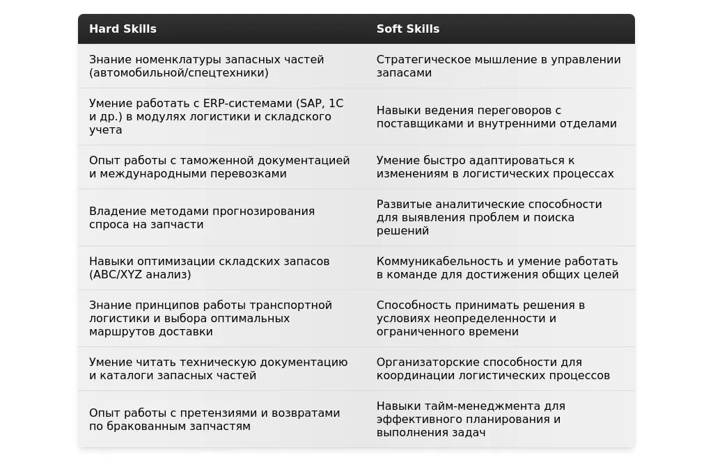 Сгруппируйте навыки по категориям (например, "Логистика", "Складское хозяйство", "ВЭД") и выделите те навыки, которые наиболее важны для данной вакансии. Разместите наиболее релевантные навыки в начале списка, чтобы они сразу бросались в глаза.