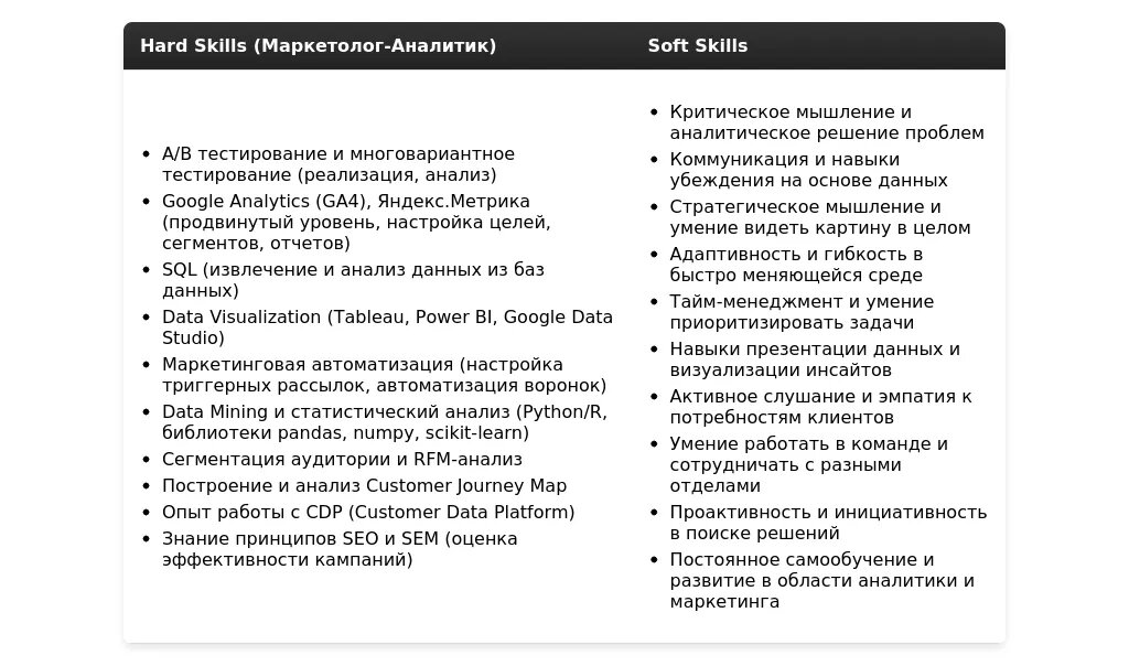 - На какие качества и навыки делать акцент: Аналитические способности, знание инструментов анализа данных (Excel, Google Analytics и т.д.), умение работать с информацией, внимательность к деталям, коммуникабельность.