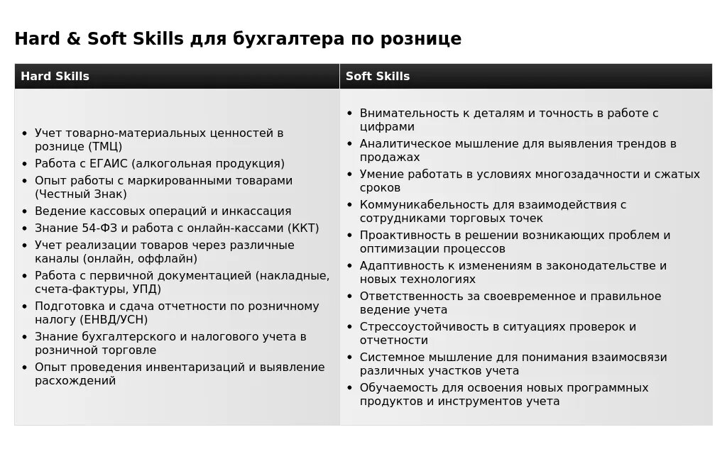 - **Для вакансий с требованием знания налогового законодательства:** "Знание налогового законодательства", "Опыт подготовки и сдачи налоговой отчетности", "Умение оптимизировать налогообложение".