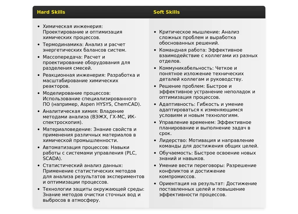 - На какие качества и навыки делать акцент: Аналитические способности, умение работать в команде, знание химических процессов и оборудования, владение специализированным программным обеспечением.