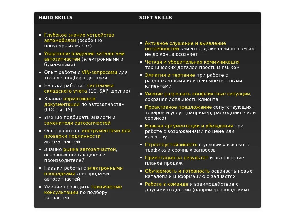 - Для продавца-консультанта автозапчастей для иномарок: "Знание устройства иномарок", "Работа с электронными каталогами (TecDoc, Autodoc)", "Подбор запчастей по VIN-коду", "Работа с VIP клиентами".