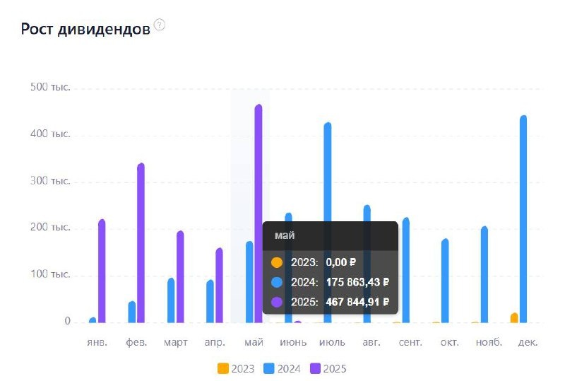 Денежный поток за май 2025 💸 Вот и позади последний день весны, а значить пришла пора взглянуть на мой Cash Flow за май, иначе зачем еще все вот это вот 😁 И так за май 2024 года я получил дивидендами 175 863 руб, неплохо, но не идеально. За май 2025 года у меня вышло 467 844 руб!!!! 💵💴💶💷 Вот это приятный уровень +166% год к году. Конечно это во много случайность, удачно совпали звезды, но... 1️⃣Пока это рекордный cash flow со время старта проекта "Работящих денег 💵" 2️⃣До этого лидерство держал декабрь 2024 с сумой 445 086 руб 3️⃣Замыкает тройку лидеров июль 2024 с 429 920 руб, тогда был разгар див сезона) ___________ В 2024 году за 5 первых месяцев я получил чистых выплат 463 550 руб в 2025 за 5 месяцев уже вышло 1 392 698 руб а за 5 мес 2023 года был 0 руб То есть за 2 года Cash flow за май вырос с 0 до 463 550 руб! Или +200,5% YoY 😱 Такие темпы роста меня устраивают)) Понятно, что сейчас будет сильное замедление, но меня вполне устраивает рост в 50% YoY ____ Лучшие солд